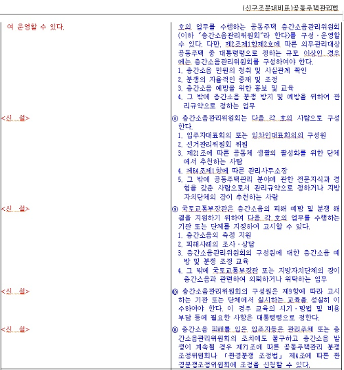 바로 층간소음관리위원회 구성 의무화 관련 개정입니다. 국토부장관이 발표했던 500세대 이상의 공동주택에서는 층간소음관리 위원회 구성을 의무화하여야 한다는 발표를 보셨을 겁니다. 이와 관련한 층간소음관리위원회 구성에 관한 신설개정이니 꼭 참고하시길 바랍니다.