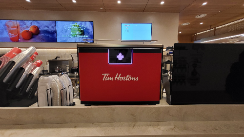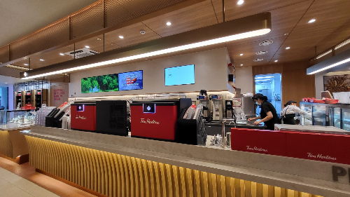 팀홀튼 선릉역점은 키오스크로 주문 하며, 한 쪽 벽에 키오스크 3대가 준비되어 있습니다.